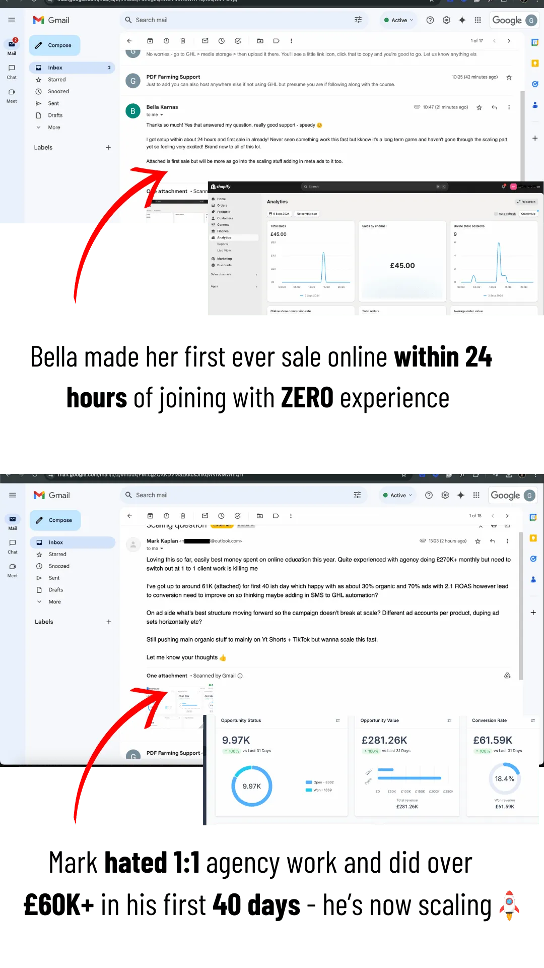 While results vary, many students see their first sales within days. Muna made $6K in her first 32 days without ads. Mark hit $61K in 40 days. The key is following our proven system exactly as we teach it however ensure you take a long term view with this.